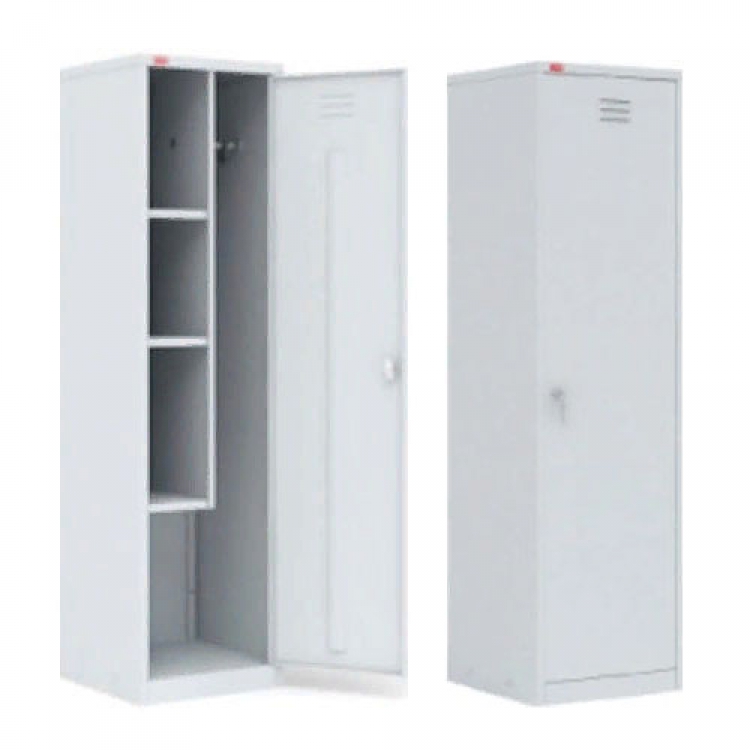 Универсальный металлический шкаф подходит для хранения сменной одежды и инвентаря. Снизу отсутствует полка, такое решение позволяет поставить полноценное ведро. Шкаф комплектуется тремя полками и перекладиной с крючками для хранения униформы.
