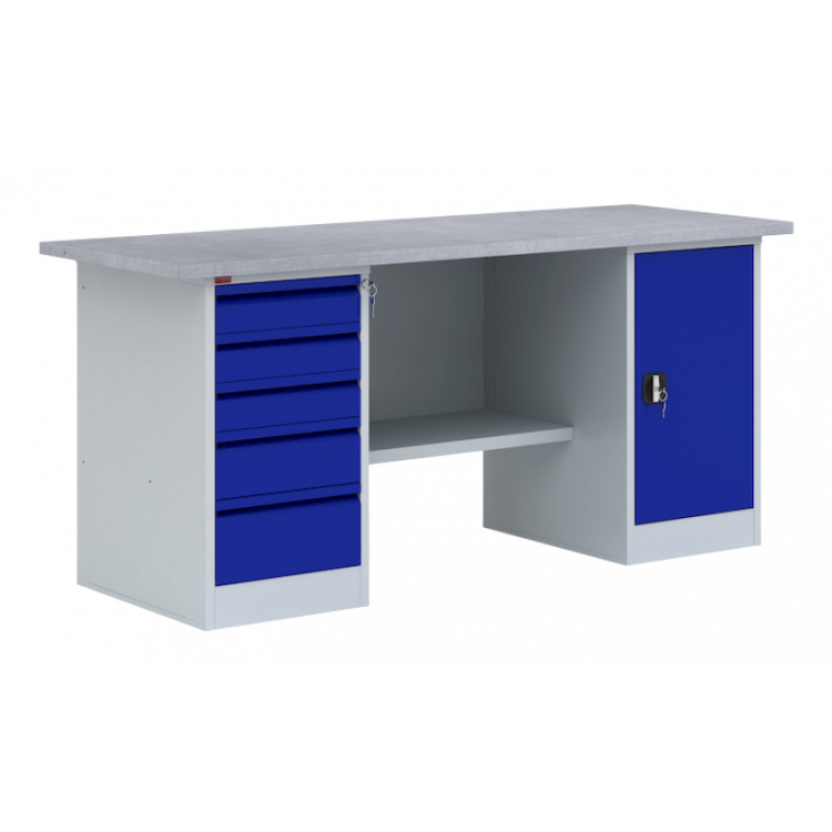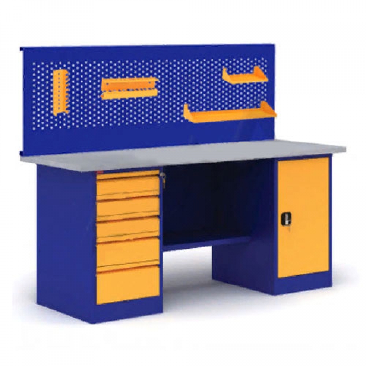 Универсальный верстак модульного типа ВП-4 состоит из следующих комплектующих: столешница с металлическим оцинкованным покрытием, тумба с двумя съемными полками и дверью, драйвер с пятью выдвигающимися ящиками. Дверца тумбы и драйвер оснащены ключевыми замками. Опционально может быть дополнен экраном с перфорацией, крючками, полками, держателями, другими вспомогательными приспособлениями.