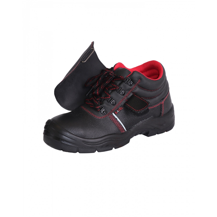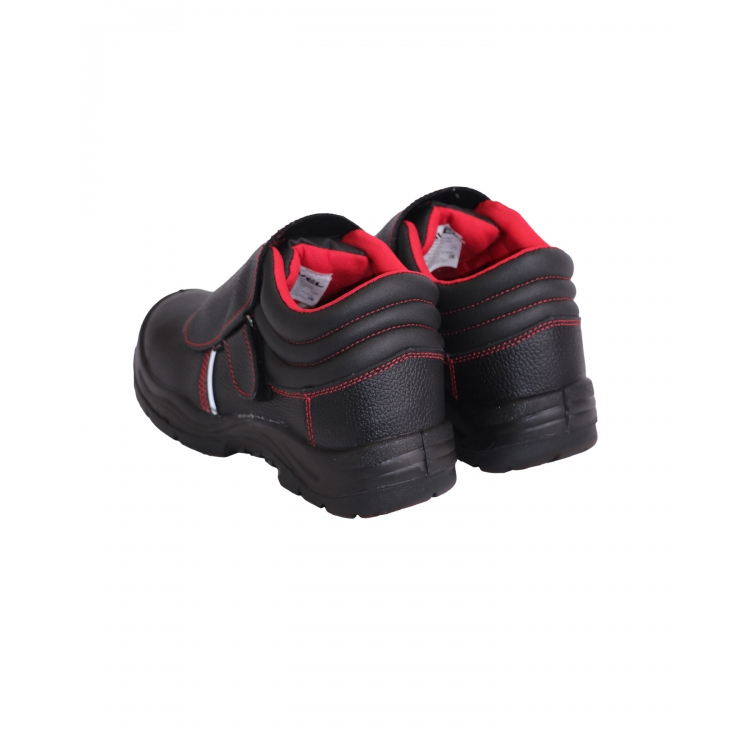 Глухой клапан со шнуровкой прикрыт плотным клапаном, что позволяет избежать попадания песка, брызг металла и других инородных частиц. Светоотражающие полосы расположены по боковым поверхностям ботинок. Яркие акцентные строчки и подклад красного цвета делают модель узнаваемой.