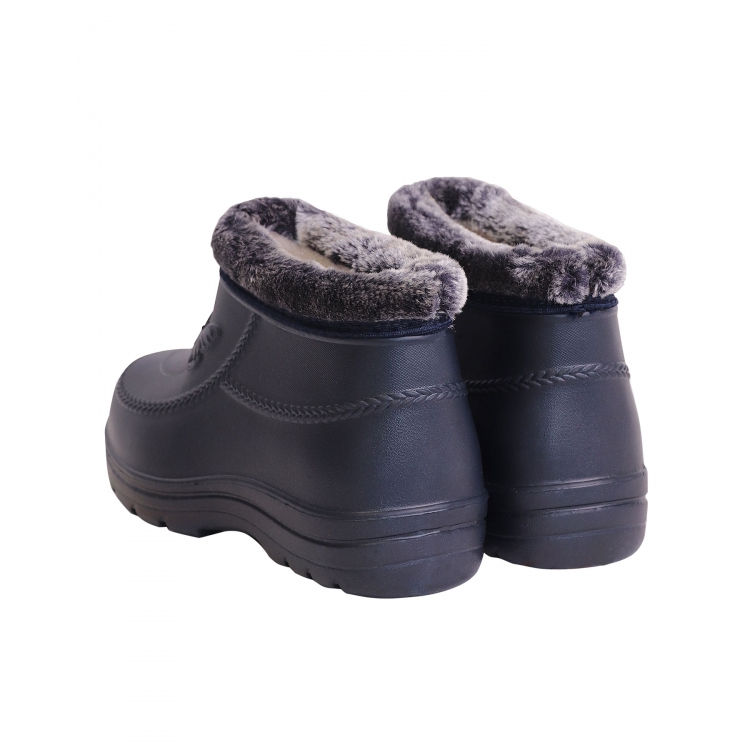 Внутренняя поверхность ботинок утеплена износостойким искусственным мехом. Ботинки выполнены в едином практичном темно-синем цвете, материал подкладки светло-серый. Подошва имеет анатомическую форму, а благодаря используемому материалу обладает повышенной мягкостью и амортизацией. Ботинки не доставляют дискомфорта в процессе носки, снижают нагрузку на суставы и позвоночник. Позволяют защитить ноги от сырости, снега, грязи.