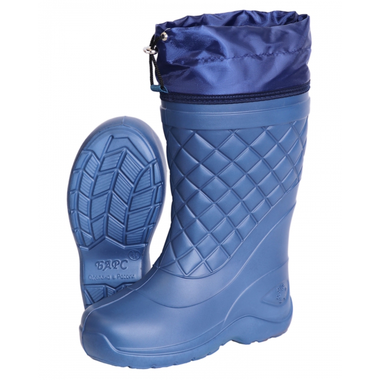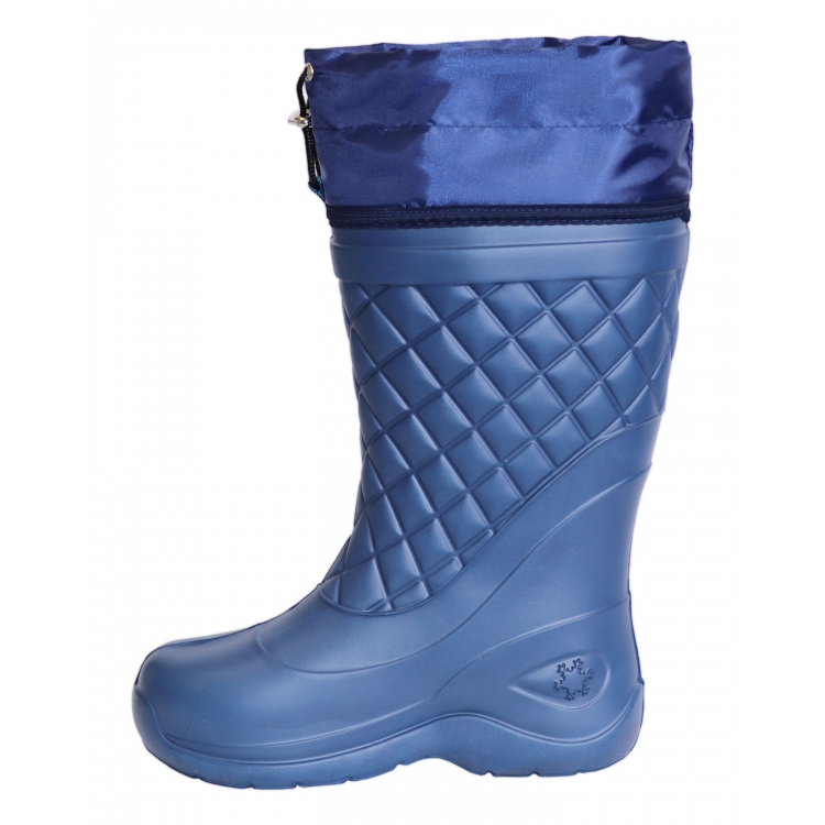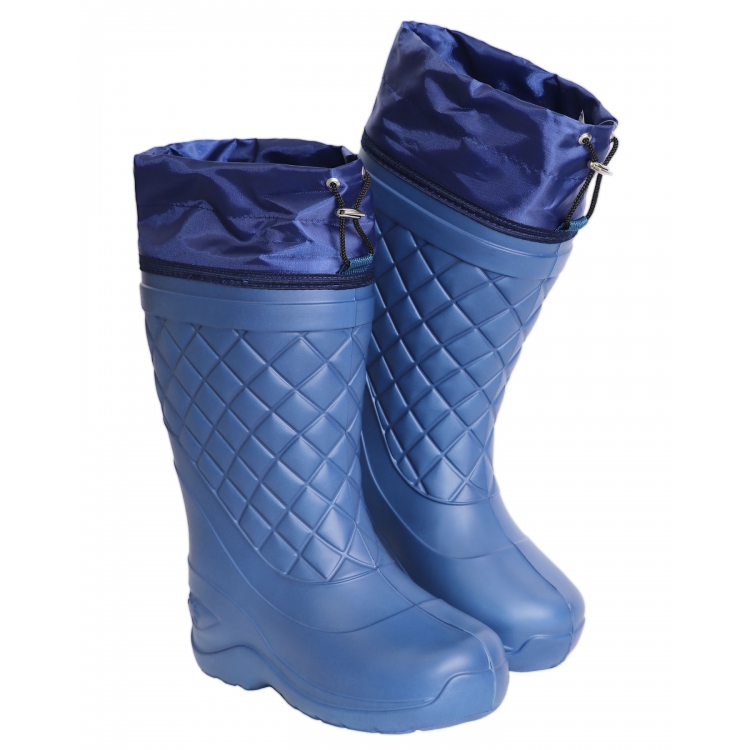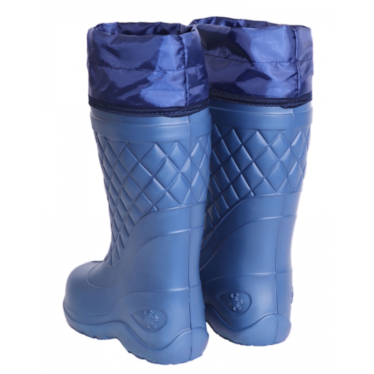 Сапоги изготовлены из ЭВА синего цвета - гипоаллергенного, легкого, амортизирующего, теплоемкого материала. Подошва имеет анатомическую форму, что снижает нагрузку на суставы и усталость при длительной носке. Подошва имеет выраженный протекторный рисунок, что позволяет предотвратить проскальзывание на неоднородных поверхностях, в том числе влажных и обледенелых.