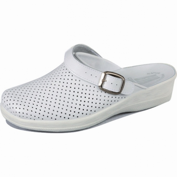 - Сабо для мужчин созданы на основе комфортной правильной колодки, которая способствует снижению усталости и напряженности. Верхний материал выполнен из легкой, прочной и износостойкой кожи с перфорацией для обеспечения хорошего воздухообмена и исключения излишнего потоотделения. Декоративная пряжка украшает изделие на верхней части. Белый материал делает обувь нейтральной и подходящей для работников различных профессий. Широкий размерный ряд позволяет использовать сабо практически любому человеку как в рабочее время, так и в повседневной носке в летнее время года.