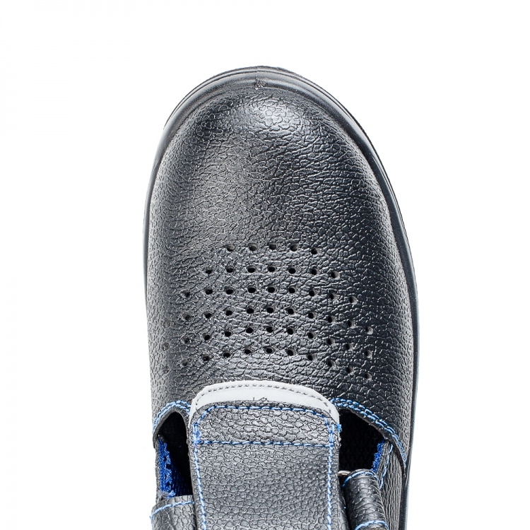 Полуботинки рабочие сандалии кожаные МП 21 изготовлены из натуральной кожи черного цвета. Благодаря используемому материалу не нарушается естественный теплообмен и вентиляция при ежедневной носке. Для дополнительного вентилирования на мыске и и боковой поверхности нанесены перфорированные отверстия. Изготовлены специально для защиты в весенне-летний период.