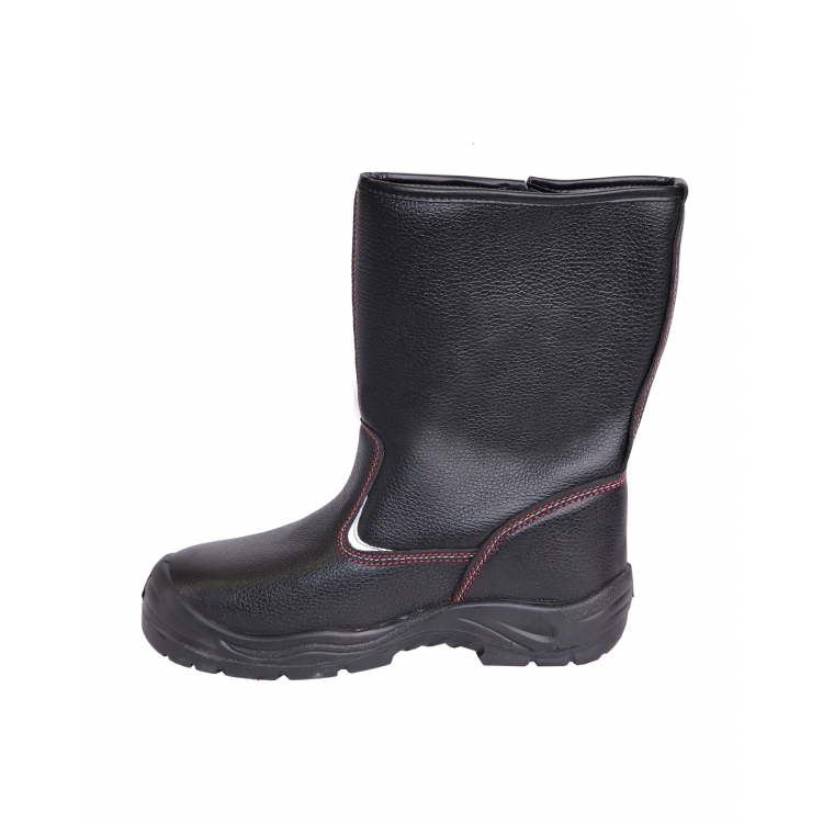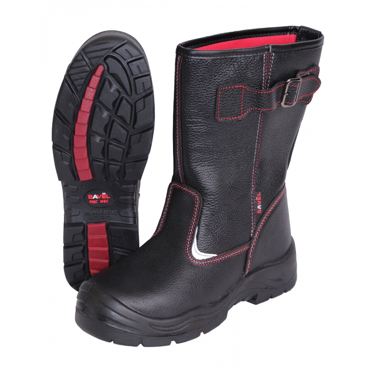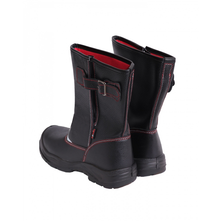 Верх выполнен из натуральной кожи черного цвета с дополнительной защитой от ВО. Внутренняя поверхность отделана сетчатой, дышащей типикой красного цвета. Все прошитые швы дополнительно проклеены для герметичности. Подошва композиционная, выполнена из ПУ-Нитрил, закреплена литьевым методом. Материал подошвы обеспечивает легкость, износостойкость, термо- и химостойкость. Поликарбонатный подносок (ПКП) позволяет защитить от ударов в носочной части энергией до 200 Дж.