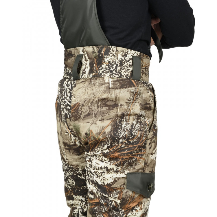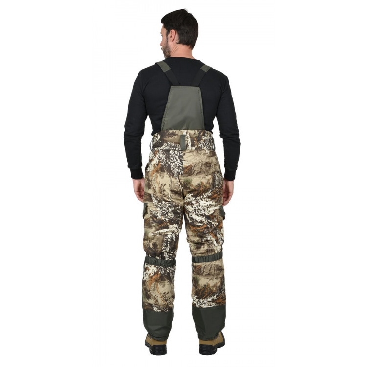 Брюки с центральной застежкой гульфика на три петли и пуговицы, с притачным поясом с застежкой на две петли и две пуговицы, пятью широкими шлевками, со спинкой и бретелями. Изделие с боковыми карманами с наклонным входом, накладными карманами на боковых швах с фигурными клапанами, застегивающимися на канадскую пуговицу, с накладками передних половинок и накладками низа задних половинок.