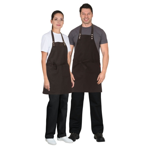 Фартук с нагрудником и с боковыми завязками для регулировки объема. Съёмная шейная бретель, пристёгивающаяся на кнопки. В нижней левой части накладной карман. На правой стороне фартука, на уровне притачивания боковых завязок, шлёвка.
