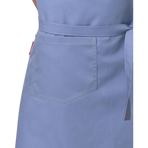 Фартук с нагрудником и с боковыми завязками для регулировки объема. Съёмная шейная бретель, пристёгивающаяся на кнопки. В нижней левой части накладной карман. На правой стороне фартука, на уровне притачивания боковых завязок, шлёвка.