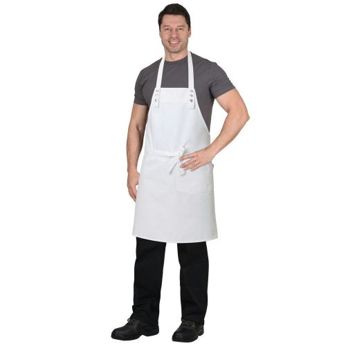 Фартук с нагрудником и с боковыми завязками для регулировки объема. Съёмная шейная бретель, пристёгивающаяся на кнопки. В нижней левой части накладной карман. На правой стороне фартука, на уровне притачивания боковых завязок, шлёвка.