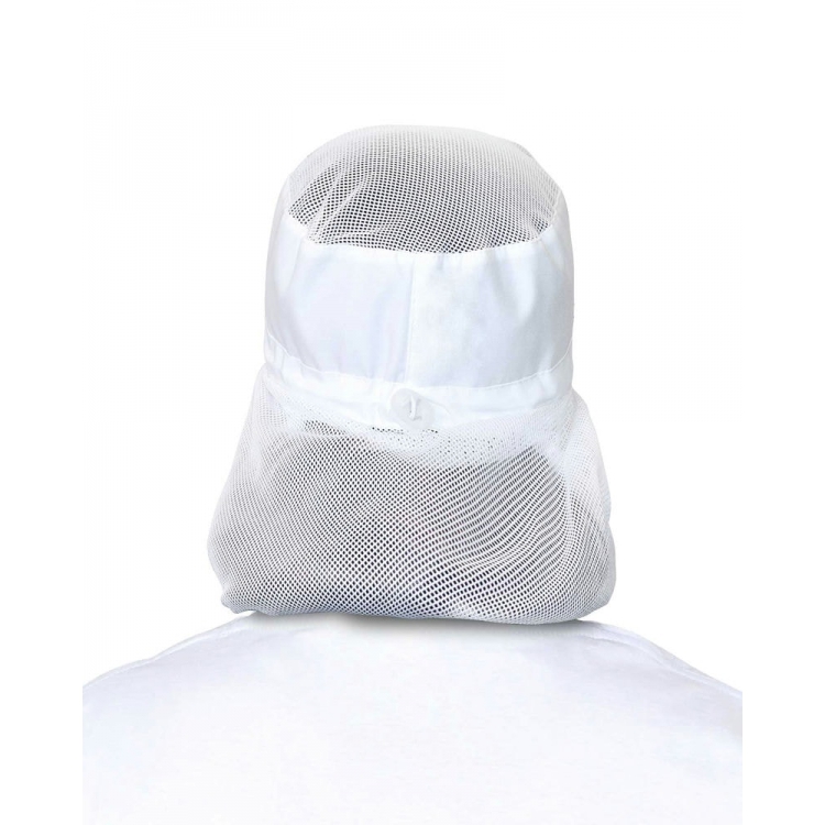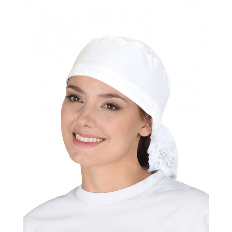 Колпак комбинированный, изготовлен из двух видов материала. Верх головного убора выполнен из трикотажной вставки для дополнительного воздухообмена. Объем по окружности головы регулируется кулиской со стопором. Сзади «мешочек» для волос из трикотажной сетки.
