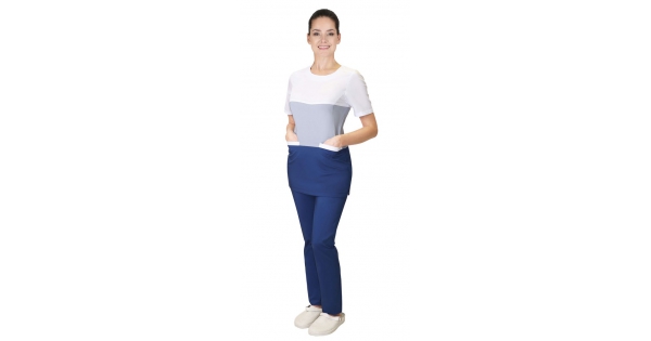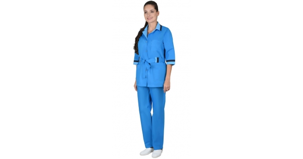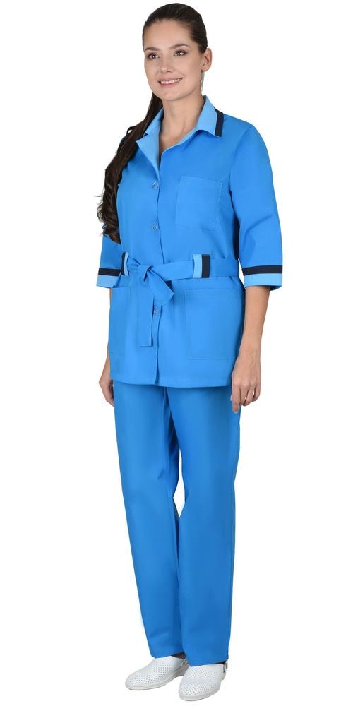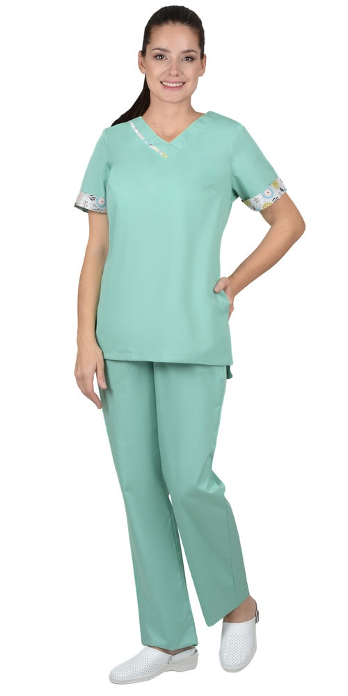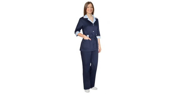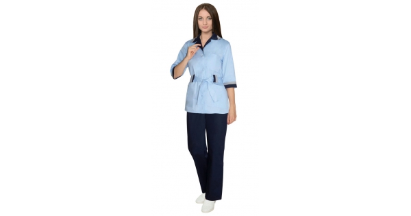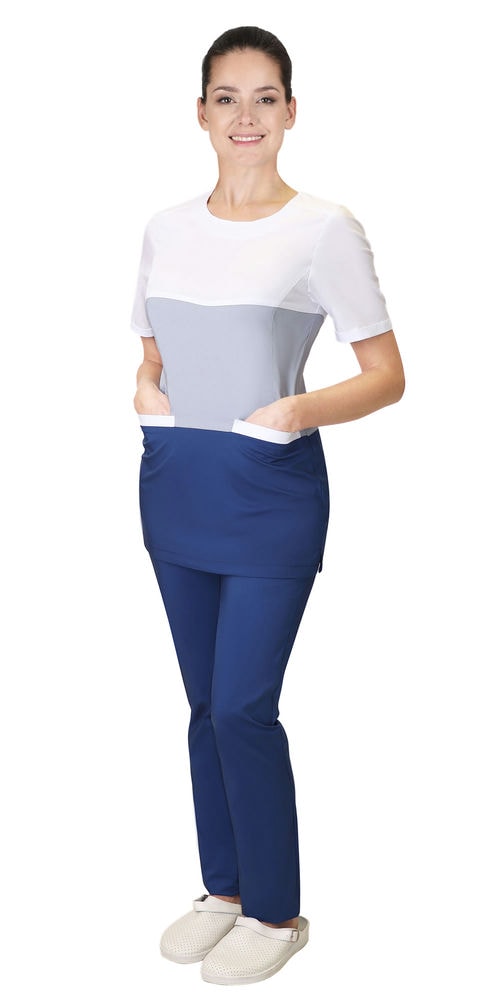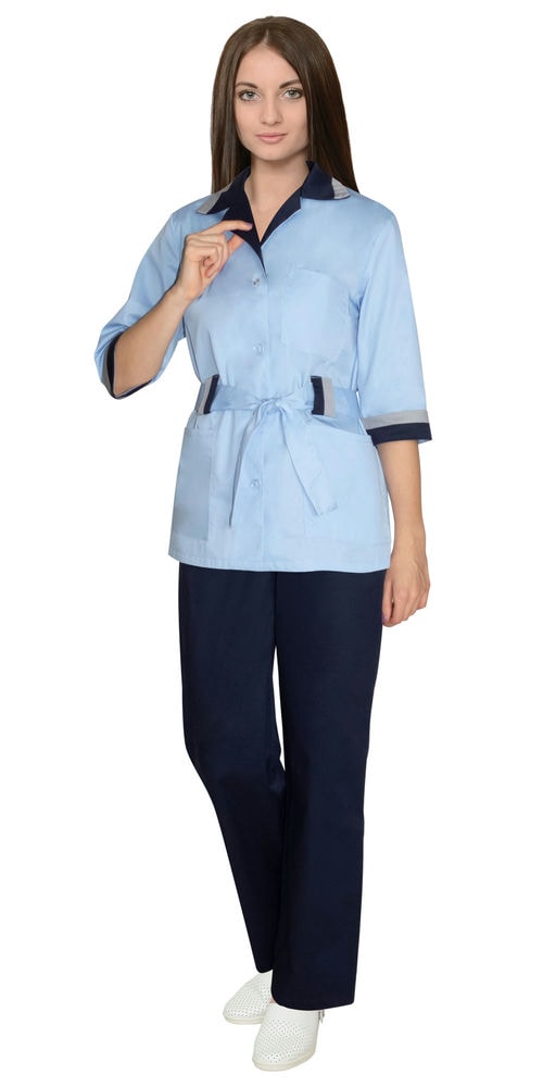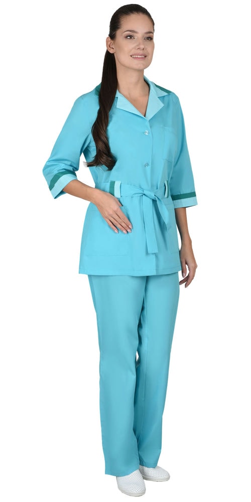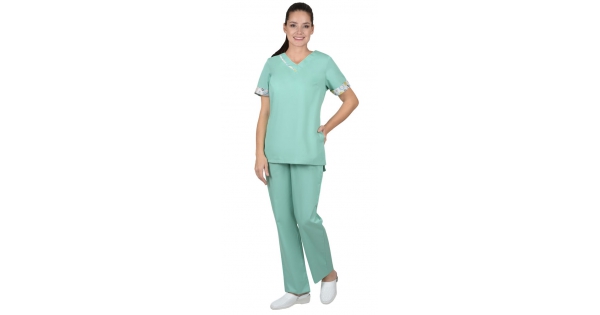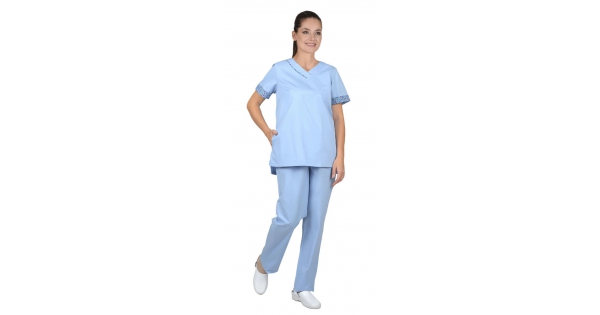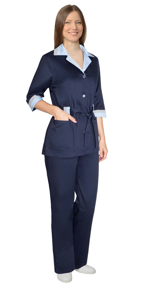 - Костюмы прекрасно подходят медперсоналу. Длинные брюки максимально оберегают ноги человека, чаще бывают прямого кроя, чтобы не сковывать движений при ходьбе, приседаниях, резких сменах положения. Блузы и рубашки выполняются со свободным удлиненным силуэтом, без застежек, с пуговицами или молниями, с небольшим количеством карманов в легкодоступных местах, с короткими или длинными удобными рукавами.
