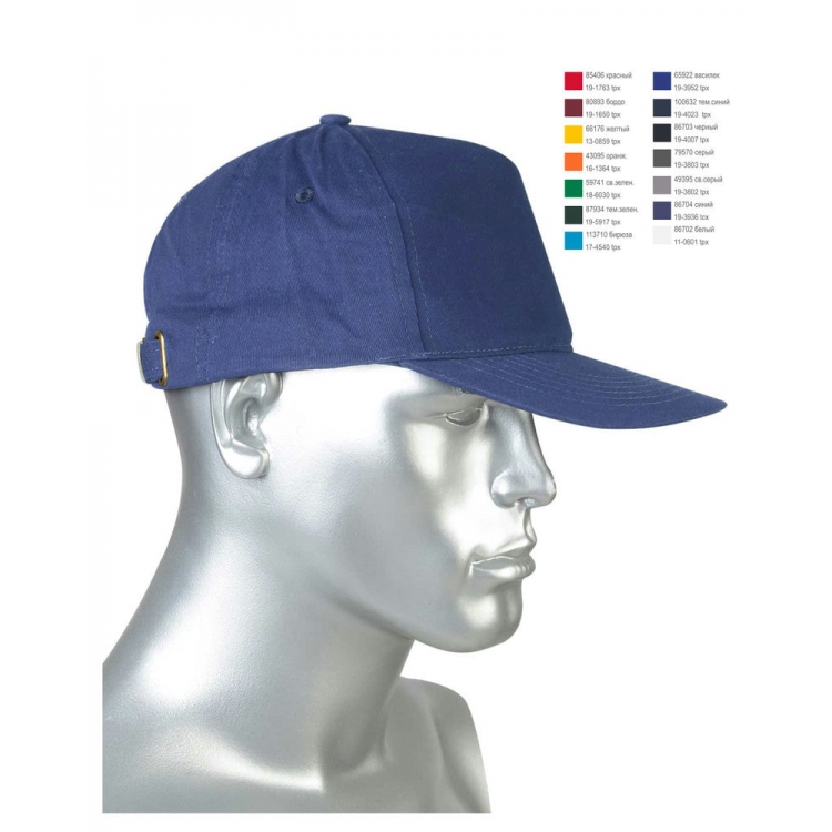Кепи-бейсболка состоит из 5-ти клиньев. Застежка металлическая расположена на правом заднем клине, там же и металлический люверс, для захода хлястика.