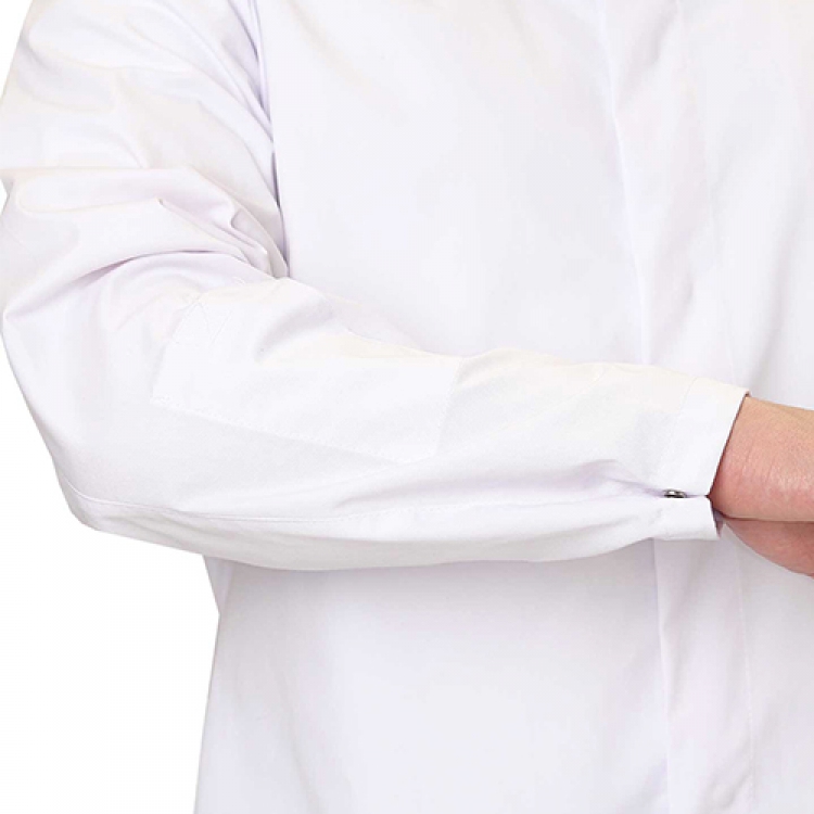 - Гигиеническая безопасность халата обеспечивается потайными застежками и карманами, один из которых расположен в области груди, а другой — на рукаве, он служит для хранения пропуска. Кнопки на центральной бортовой планке скрыты верхним клапаном. Стояче-отложной воротник оберегает шею от ветра и мусора. Манжеты фиксируются кнопками. На задней части регулировку по ширине выполняют два хлястика с кнопками, а для комфорта движений при ходьбе есть шлица по низу изделия.