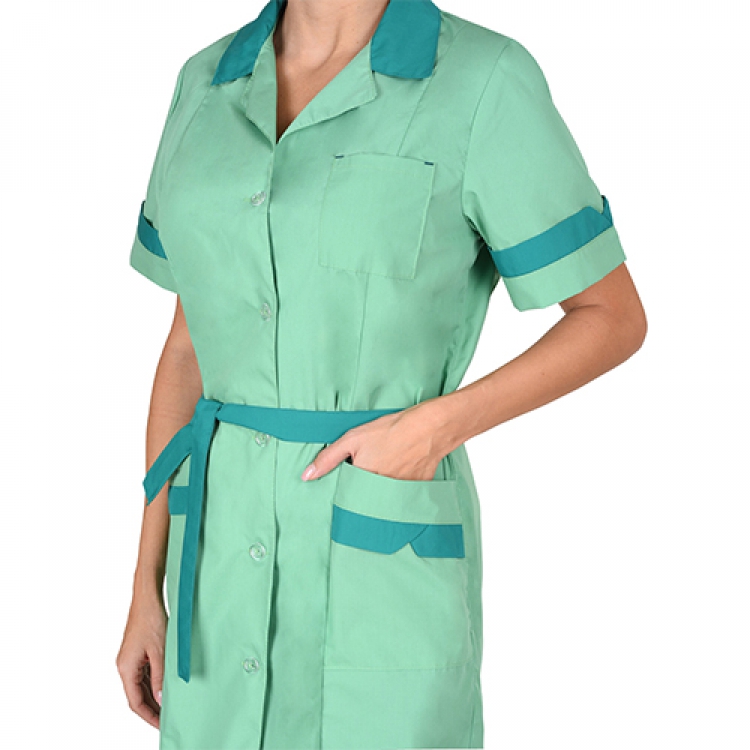 - Халат застегивается по центральной планке на пуговицы с петлями. Стояче-отложной воротник придает одежде классический вид. Накладные карманы имеют свободный открытый вход и расположены в легкодоступных местах. Пояс фиксируется шлевками в боковых швах и способствует надежной посадке изделия на талии. Декоративную отделку выполняет ткань темно-зеленого цвета на воротнике, укороченных рукавах, карманах.