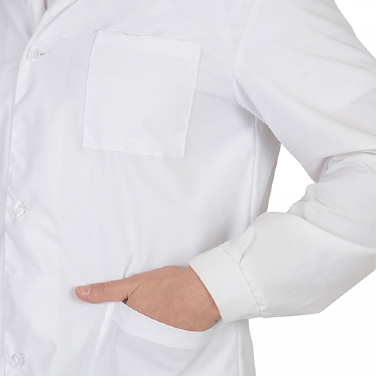 - Центральная застежка выполнена в виде планок с петлями и пуговицами. Стояче-отложной воротник защищает шею и придает классический вид халату. Накладные карманы с открытым доступом в области груди и бедер дают возможность хранить необходимые вещи под рукой. Хлястик на спинке позволяет регулировать ширину одежды по талии. Манжеты с пуговицами надежно фиксируют рукава на запястье.