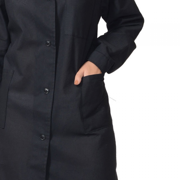- Прямой крой женского халата способствует хорошей и комфортной посадке. Черный цвет устойчив к производственным и иным загрязнениям. Отложной воротник придает одежде классический и лаконичный вид.