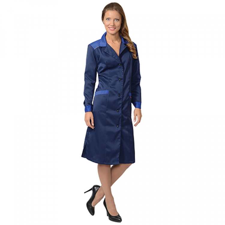 - Женский халат Технолог синего цвета с яркой отделкой пользуется популярностью благодаря универсальности и практичности модели. Светоотражающий кант на кокетках увеличивает сигнальную видимость при неблагоприятных условиях и в темное время суток. Оптимальный состав ткани, состоящей из 80% полиэстера и 20% хлопка, позволяет основному смесовому материалу быть легким и комфортным, устойчивым к износу, разрывам и истиранию, простым в уходе и прекрасно эксплуатируемым в летнее время года на открытом воздухе или в помещениях.