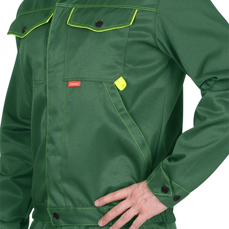- Костюм Докер от бренда Сириус состоит из куртки и комбинезона. Яркий зеленый цвет с желтой отделкой привлекает внимание работающего человека. Основная смесовая ткань из 80% полиэстера и 20% хлопка является доступной по цене и соответствует всем параметрам для изготовления рабочей летней спецодежды.
