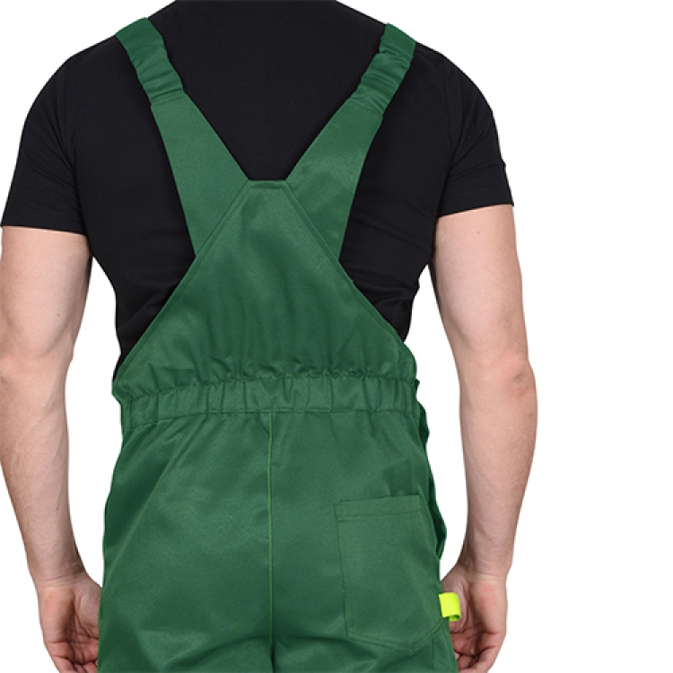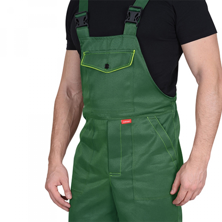 - Полукомбинезон с пряжками-фастами и эластичными лямками подходит людям разного роста. Гульфик и боковой шов застегиваются при помощи пуговиц. Нагрудный карман закрывается и предотвращает выпадение из него предметов, а остальные карманы — открытые со свободным доступом. Сзади по талии имеется утяжка эластичной лентой, которая не сковывает движений, но способствует фиксации полукомбинезона.