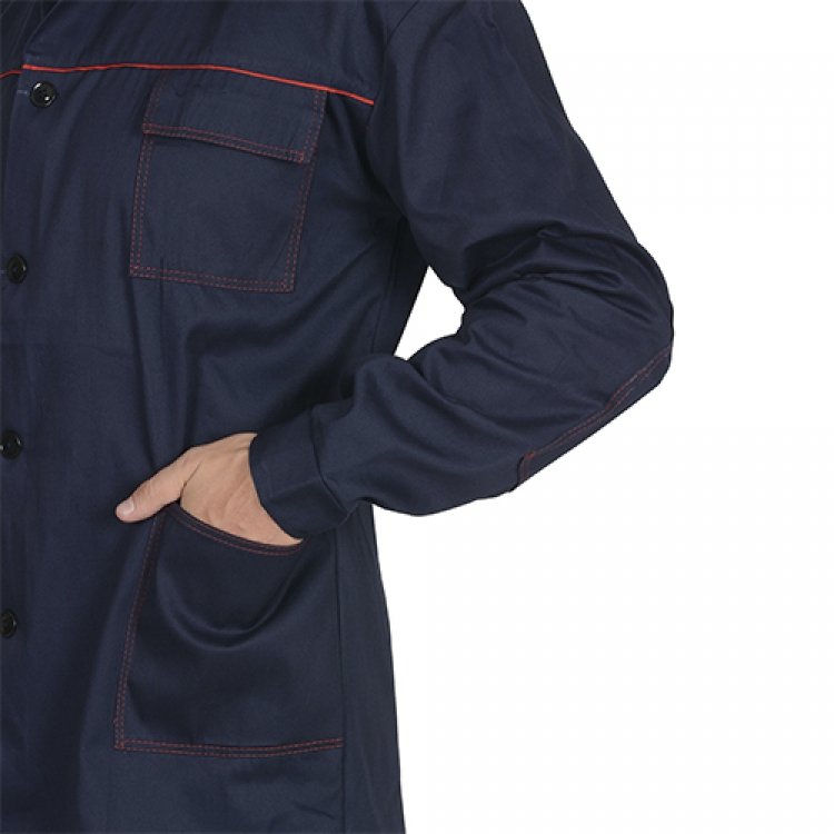 - Удлиненная прямая куртка застегивается пуговицами на центральной планке и манжетах. Три накладных кармана, один из которых имеет закрывающий клапан, расположены в легкодоступных местах. На области локтей есть дополнительные накладки для усиленной защиты.