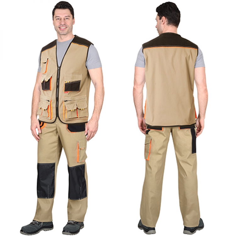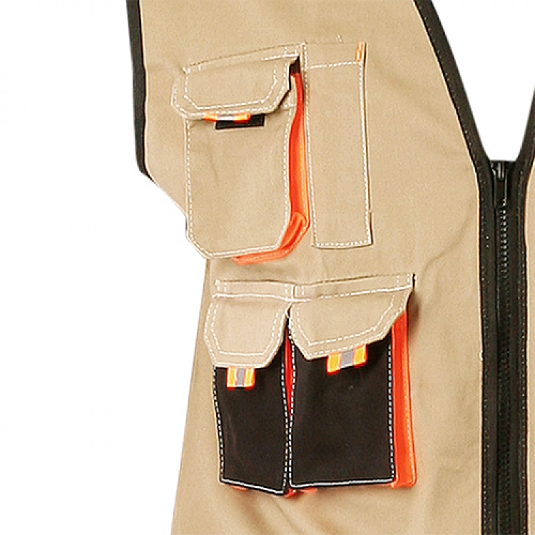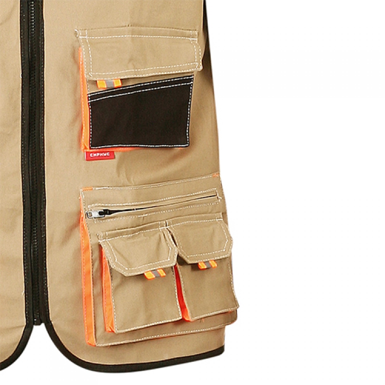 - Костюм Манхеттен выполнен из особо прочной смесовой ткани, состоящей из 98% хлопка и 2% эластана. Высокая плотность материала (245 г/кв.м) гарантирует износостойкость и необходимые защитные свойства. Объемные карманы на брюках и жилете отделываются яркой оранжевой тканью и световозвращающими рефлекторами. Их большое количество придает комплекту эргономичности и практичности.