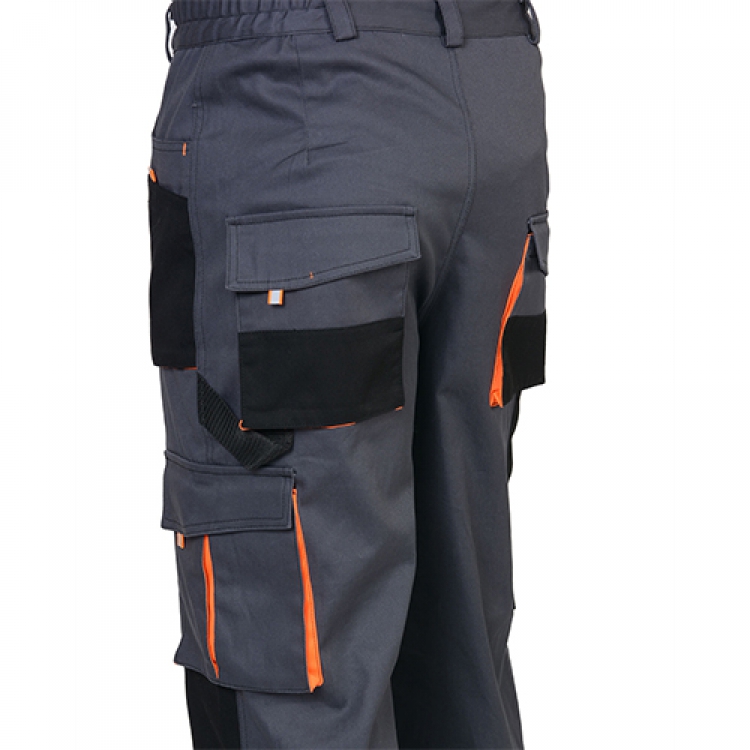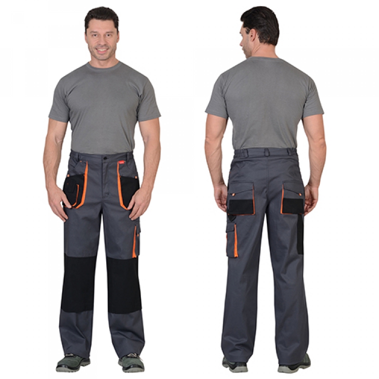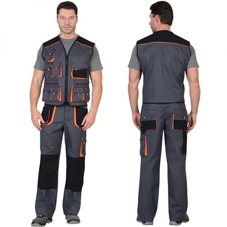 - Костюм Манхеттен практичного темно-серого цвета отделан ярко-оранжевыми вставками, кантами и строчками. Большое количество объемных накладных карманов позволяет вместить мелкие предметы и вещи покрупнее, это прибавляет комплекту эргономики и удобства. Светоотражающие рефлекторы выполнены из ранцевой ленты.