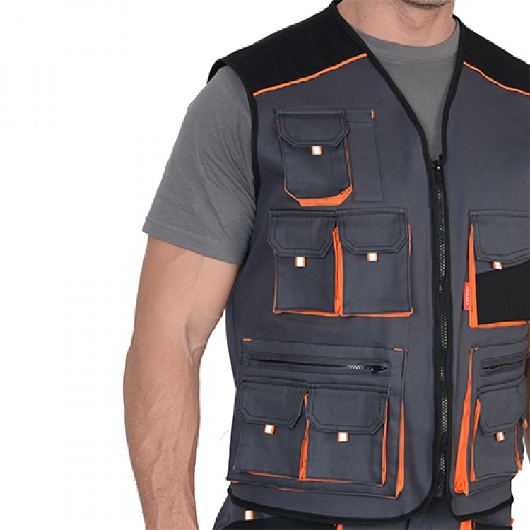 - Жилет Манхеттен (арт. 100392) с V-образным вырезом застегивается на черную молнию, в цвет отделочного канта. Прямой силуэт и свободный крой не сковывает движений и не препятствует различным манипуляциям работающего человека.