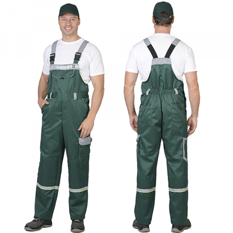 • Прямой полукомбинезон регулируется по длине бретелями с фаст-пряжками. Гульфик и боковой шов застегиваются пуговицами. Нагрудный и боковой набедренный карман закрываются клапанами. На спинке по талии для утяжки вшита резинка, а для фиксации ремня пришиты шлевки по всему периметру пояса. Наколенники усиливают защитную функцию ног.