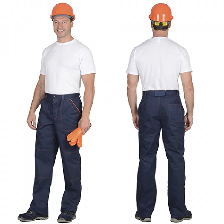 • Брюки застегиваются по притачному поясу на пуговицу. Для фиксации ремня на изделие нашиты шлевки. На передних половинках карманы глубокие с косым входом, а на задней половинке — один накладной небольшой карман. Наколенники обеспечивают усиленную защиту ног.