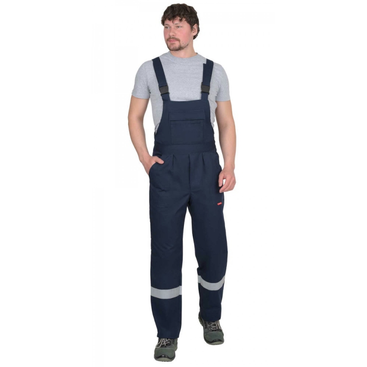 Полукомбинезон спереди с застежкой на пуговицы, с боковыми накладными карманами, нагрудник с большим накладным карманом с клапаном на липучке. Сзади полукомбинезон по талии стянут резинкой для лучшего прилегания по фигуре, с накладными карманами. Бретели с резинкой, длина бретелей регулируется застежками-фастексами.