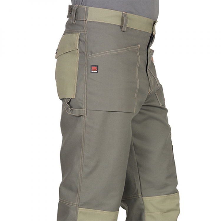 • Брюки Вест-Ворк (арт. 04360) застегиваются на пуговицу, а по поясу дополнительно регулируются хлястиками с кнопками. Для фиксации ремня пришиты неширокие шлевки. Передние накладные карманы открытые и имеют косой срез. Верхние задние и набедренный карманы закрываются застежками-кнопками. Защитные наколенники светло-оливкового цвета позволяют вставлять в них объемные щитки.