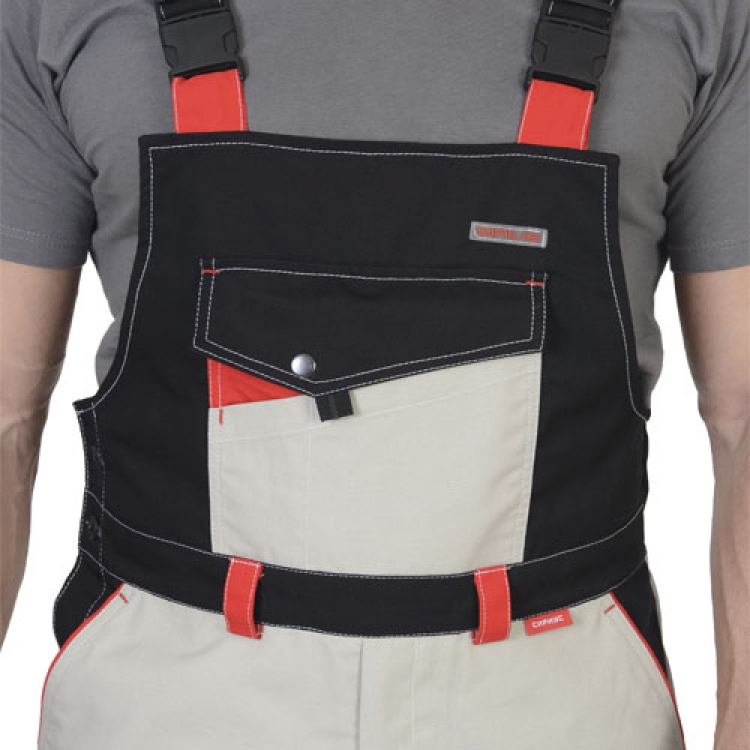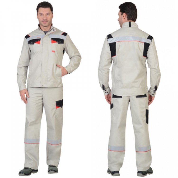 Удобный рабочий костюм куртка и полукомбинезон светлого цвета.
