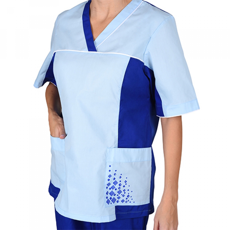 - Блуза с укороченными рукавами выполнена в прямом удлиненном силуэте. V-образный вырез из двух цветов выглядит привлекательно и женственно. Одежда отделана белым кантом в области груди и по краю рукавов и воротника. Накладные карманы со свободным входом расположены в легкодоступных местах и позволяют держать под рукой необходимые инструменты, ручки и другие предметы.