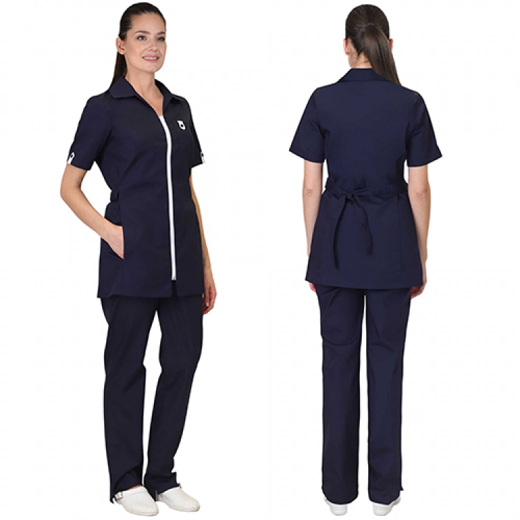 - Женский костюм Лира темно-синего цвета изготовлен из смесовой ткани, состоящей из 65% полиэстера и 35% хлопка. Основной материал плотностью 115 г/кв.м обладает высокой износостойкостью, защищает от повреждений и загрязнений, пропускает воздух, неприхотлив в уходе. Комплект соответствует межгосударственному стандарту ГОСТ 25294-2003 и имеет подтверждающие сертификаты.