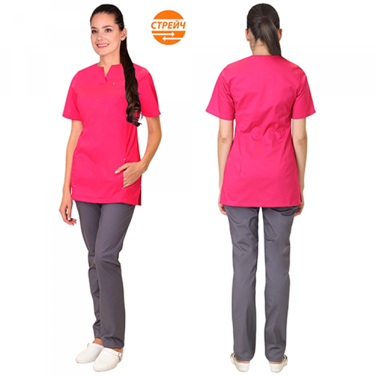 - Женский костюм Валерия выполнен из блузы цвета фуксии и серых брюк. Материал Твил-Стрейч изготовлен из 55% хлопка и 45% полиэстера. Он обладает прекрасным воздухообменом и комфортом, повторяет движения тела человека, не деформируется в процессе длительной эксплуатации и не подвергается воздействию солнечных лучей.