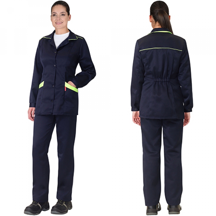 - Женский костюм Золушка из темно-синей смесовой ткани прекрасно подойдет для работы в теплое время года. Его легкость и практичность, а также доступная цена и простота в уходе являются преимущественными особенностями. Основной материал состоит из 80% полиэстера и 20% хлопка, он практические не сминается, быстро высыхает, обладает достаточным воздухообменом, комфортом и удобством. Комплект соответствует межгосударственному стандарту ГОСТ 12.4.280-2014.