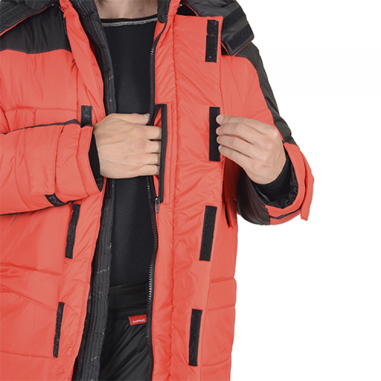 - Куртка Европа застегивается двухзамковой молнией, скрытой под двумя ветрозащитными планками с липучками и кнопкой. Утепленный капюшон пристегивается к воротнику-стойке молнией и имеет пластиковые фиксаторы для утяжки. Многофункциональные карманы с различными вариантами закрытия имеют клапаны и удобный доступ, а внутренний карман застегивается при помощи контакт-ленты. По низу изделия вставлен шнур с фиксаторами для утягивания по ширине. Регулировка манжет осуществляется посредством пат с липучками.