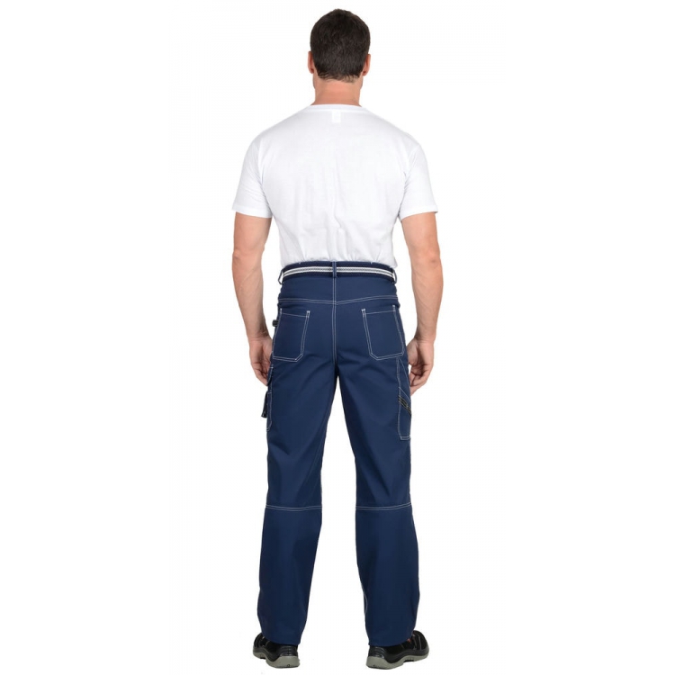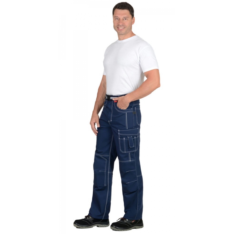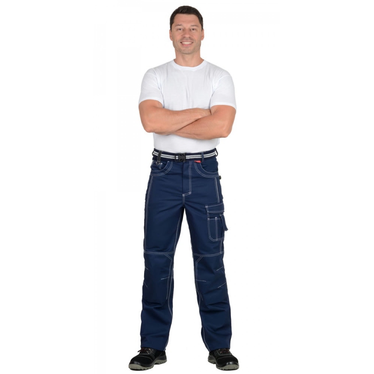 Брюки прямого силуэта и комплектуются съемным ремнем из резинки с застежкой-фастекс. Брюки с застежкой гульфика на молнию. Передние половинки с боковыми внутренними карманами, справа часовой карман и фигурные объемные наколенники. На левом боковом шве передних половинок накладной комбинированный карман с клапаном. Клапан застегивается на липучку. Задние половинки с отрезной кокеткой, с накладными карманами и карманами под инструменты. Притачной пояс брюк с резинкой по боковым сторонам для мягкого прилегания. В передних половинках брюк предусмотрен кант СВМ.