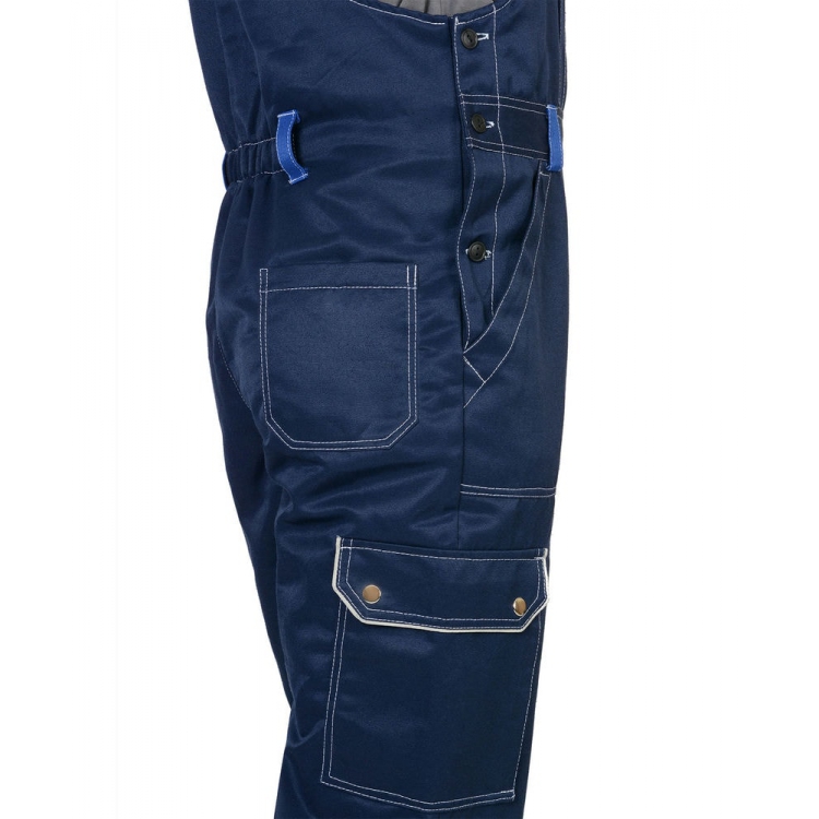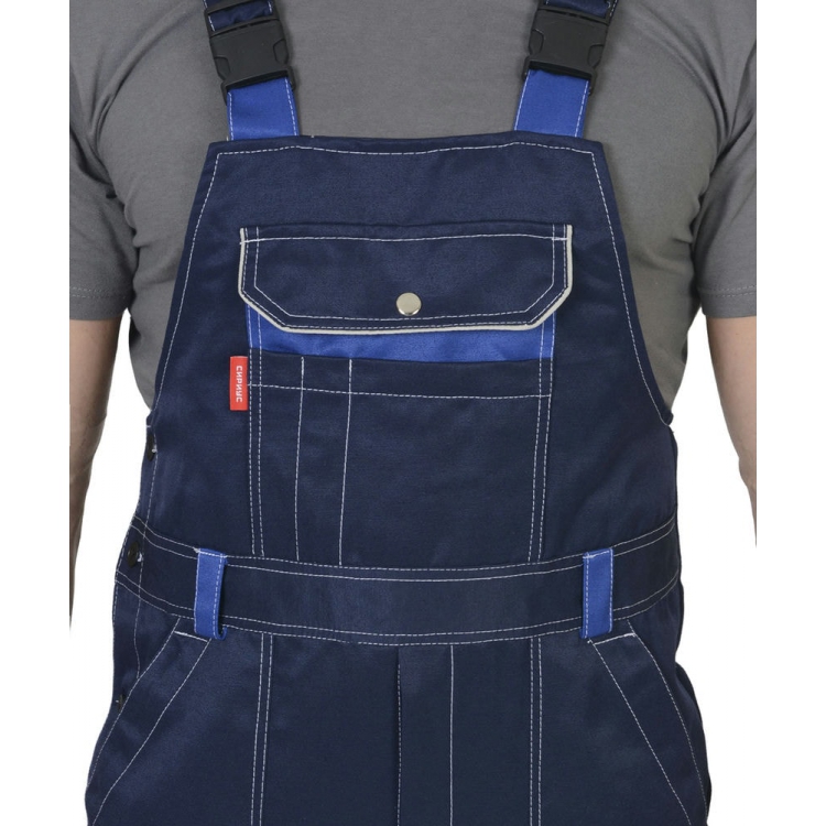 Полукомбинезон с застежкой гульфика на молнию, с правой боковой застежкой на пуговицы. На грудке комбинированный карман с фигурным клапаном на кнопку, по бокам внутренние карманы, наколенники. На боковых швах накладные карманы с клапанами на кнопки, на правой задней половинке накладной карман. По спинке резинка для лучшего прилегания. Полукомбинезон с бретелями, длина регулируется резинкой и застежкой-фастексом.