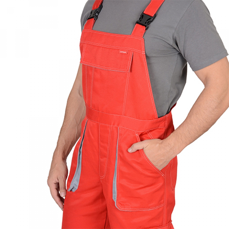 - Регулировка по длине осуществляется посредством эластичных бретелей. При этом полукомбинезон имеет вариации ростовок и размеров, благодаря чему данный вид летней спецодежды можно подобрать человеку с любой комплекцией. Для удобства посадки на фигуре по талии на задней части вшита ткацкая резинка. На отрезной грудке нашит карман в клапаном. Эргономичность повышает большое количество карманов с открытым и закрытым доступом. В боковом шве застегивание предусмотрено тремя пуговицами. Наколенники дополнительно защищают ноги от повреждений.