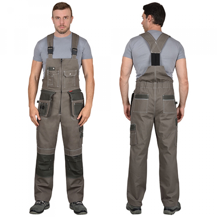 - Бретели регулируются вставкой эластичной ленты и пряжками. Основная застежка-молния расположена от низа до грудки. По спинке утяжку выполняет эластичная резинка. Накладные карманы закрываются клапанами либо имеют удобный открытый вход. Объемные наколенники дополнительно оберегают ноги.