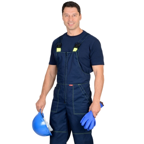 Полукомбинезон прямого силуэта, с центральной застежкой на молнию, прикрытую напуском, с накладными боковыми карманами на передних половинках. Сзади полукомбинезон по талии частично стянут резинкой для лучшего прилегания по фигуре. Полукомбинезон с бретелями с резинкой, длина бретелей регулируется застежкой-фастексом.