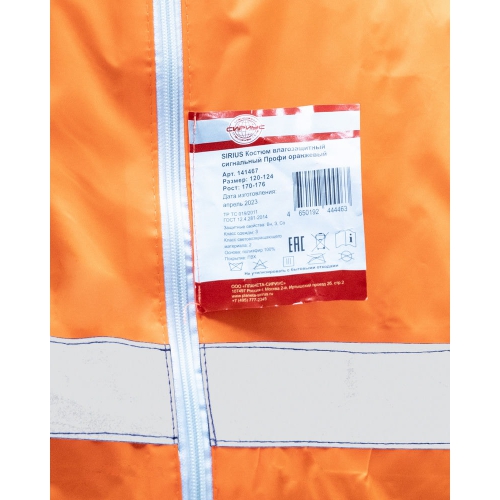 Соответствует 3-му классу по ГОСТ Р 12.4.219-99 «Одежда специальная сигнальная повышенной видимости», 3-ий класс защиты от воды.