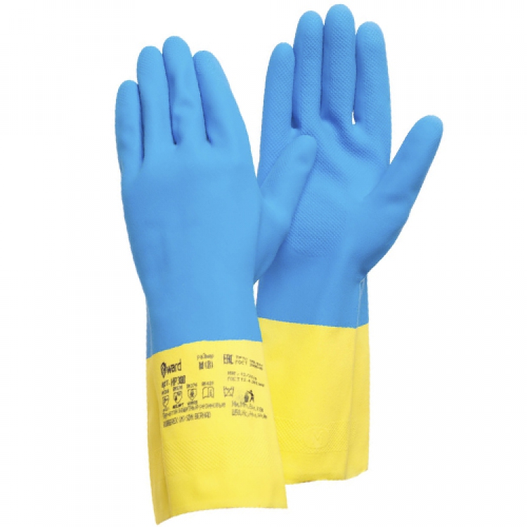 - Химстойкие перчатки Gward HP300 произведены из натурального латекса с добавлением неопрена, а внутри покрыты хлопком. Они окрашены в синий цвет по рабочей области и желтый — по манжету.