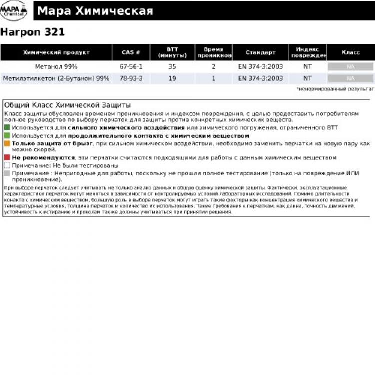 | Соответствие EN 374-3 | Type B (KPT), Гидроксид натрия - 40 %, Перекись водорода - 30%, Формальдегид - 37%. |