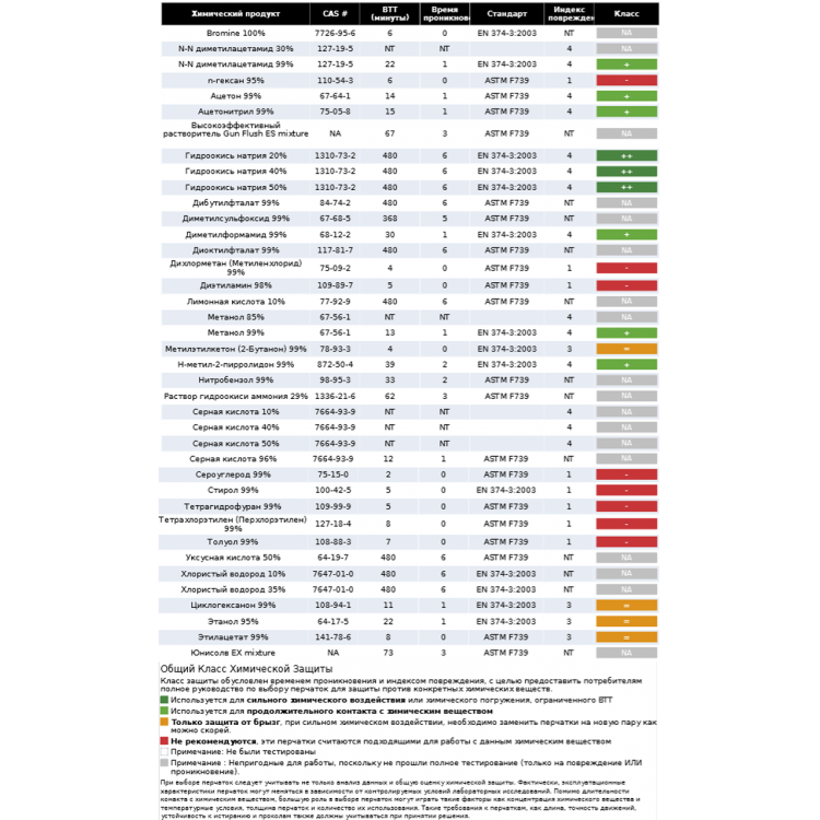 | Соответствие EN 374-3 | Type A (ALMNST), Метанол, Серная кислота 96%, Азотная кислота 65%, Уксусная кислота 99%, Фтористоводородная кислота 40%, Формальдегид 37%. |