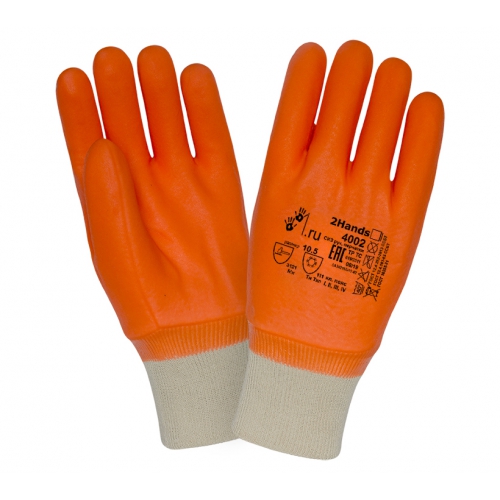 Перчатки с ПВХ-покрытием 2Hands 4002 -одна из наиболее востребованных моделей защитных перчаток. Защитное покрытие двойное, выполнено из эластичного ПВХ, обладающего морозостойкими свойствами. Покрытие предусмотрено по всей поверхности перчаток, кроме манжета, окрашено в сигнальный оранжевый цвет.