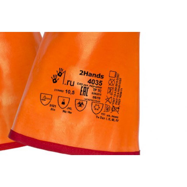 Покрытие покрывает всю поверхность перчаток, окрашено в оранжевый цвет. Внешний слой покрытия шероховатый, что позволяет обеспечить наилучший хват в различных условиях. Перчатки удлиненные 350 мм, выполнены в размере 10.5. Информация о защитных свойствах вынесена на тыльную сторону перчаток. Перчатки с ПВХ-покрытием 2Hands 4035 удовлетворяют требованиям ТР ТС 019, что подтверждено декларацией о соответствии. Перчатки герметичны, защищают от ОПЗ, гарантируют надежную защиту от истираний и ограниченную от проколов и порезов, от воздействия минусовых температур. Могут быть использованы ремонтниками, строителями, работниками коммунального хозяйства.