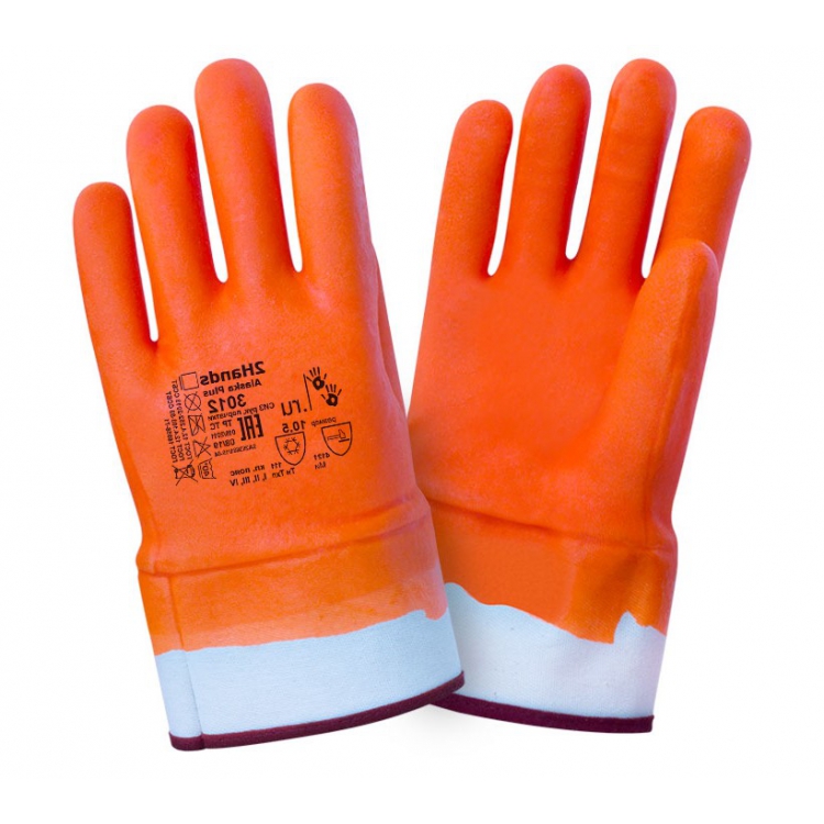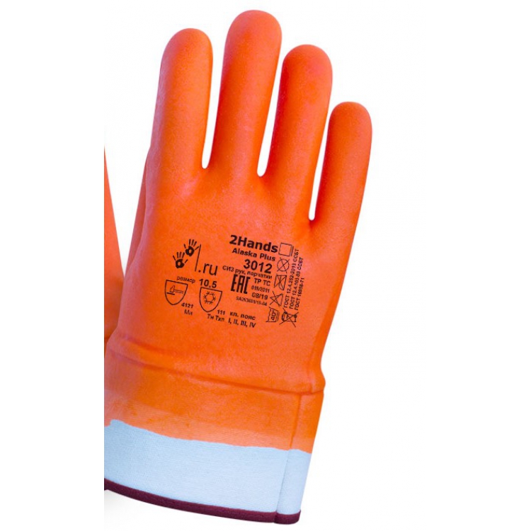 Покрытие имеет яркий оранжевый цвет, покрывает всю поверхность перчаток, кроме манжет. Внешний слой покрытия шероховатый, что обеспечивает надежный хват. Манжета из флиса выполнена в виде краги. Ворсистый бесшовный трикотаж перчаток обеспечивает сохранение тепла рук при температуре до минус 25. Перчатки выполнены в размере 10.5. Информация для потребителя вынесена на тыльную сторону. Перчатки с ПВХ-покрытием 2Hands ALASKA PLUS 3012 имеют декларацию о соответствии, удовлетворяют требованиям ТР ТС 019. Перчатки герметичны, защищают от ОПЗ, растворов агрессивных веществ, гарантируют надежную защиту от истираний и иных механических воздействий, воздействия минусовых температур.