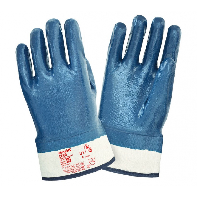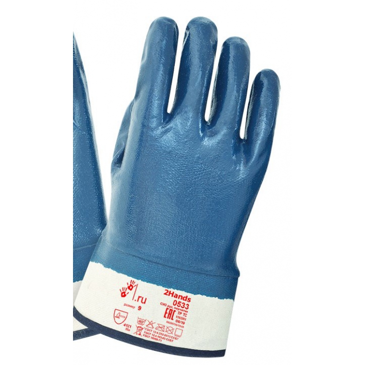 Перчатки трикотажные с нитриловым покрытием 2Hands 0533 - одна из наиболее универсальных моделей защитных перчаток. Материал основы - бесшовное трикотажное полотно из джерси белого цвета. На рабочей поверхности перчаток нанесено защитное нитриловое покрытие синего цвета. Манжета выполнена в виде краги, что особенно удобно при экстренном снимании СИЗ. Защитное нитриловое покрытие позволяет защитить руки от проколов, порезов и других механических повреждений, а также обеспечивает герметичность и химическую стойкость к воздействию слабых растворов агрессивных веществ, общепроизводственных загрязнений, масел и нефтепродуктов.