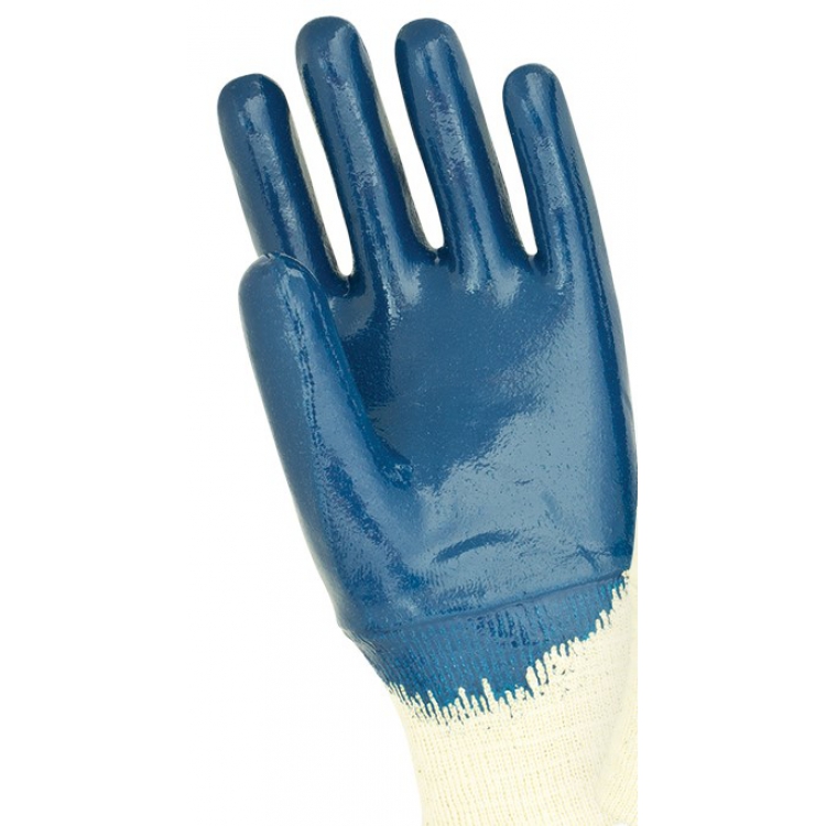 Поверхность перчаток на 3/4 покрыта защитным нитриловым покрытием синего цвета для обеспечения защиты от общепроизводственных загрязнений, слабых растворов агрессивных веществ, масел и нефтепродуктов. Защитное покрытие обеспечивает стойкость к механическому истиранию и различным повреждениям.